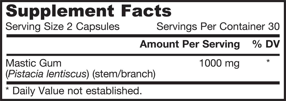 Мастиковата смола е натурален продукт, който е бил използван над 2500 години, за да се насърчава здравето на червата, стомаха и черния дроб. Въпреки това, едва през средата на 1980 г., изследователите потвърдиха ефикасността на мастиковата смола в подкрепа на клетките и тъканите на стомаха и дванадесетопръстника. Установено е, че приема на един грам дневно е безопасна и ефективна подкрепа на здравето на стомаха. В допълнение към неговите антиоксидантни свойства, учени също смятат, че мастиковата смола е полезна за баланса на стомашната секреция.
