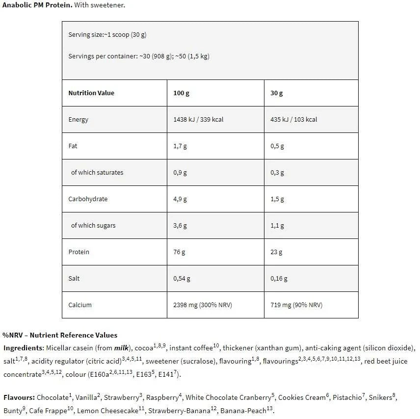 Anabolic PM Protein изграден от 100% Мицеларен Казеин, ето ще рече, че получвате най-висок клас, бавноусвоим протеин, който ще подпомогне възстановяването на мускулатурата Ви докато спите или в периоди от няколко часа, в които нямате възможност да се храните!