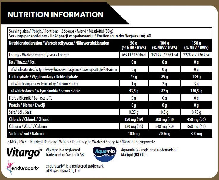 Vitargo е специално формулиран въглехидрат за висока усвоемост, който бързо попълва гликогеновите депа и доставя енергия по време на спорт. В допълнение към въглехидратите, продуктът съдържа калий и магнезий, които помагат за поддържане на електролитния баланс и мускулната функция.
