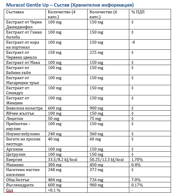 Муракол – Muracol Gentle Up Биволска коластра, сминдух, черен джинджифил – 500 mg – Капсули 120 бр.