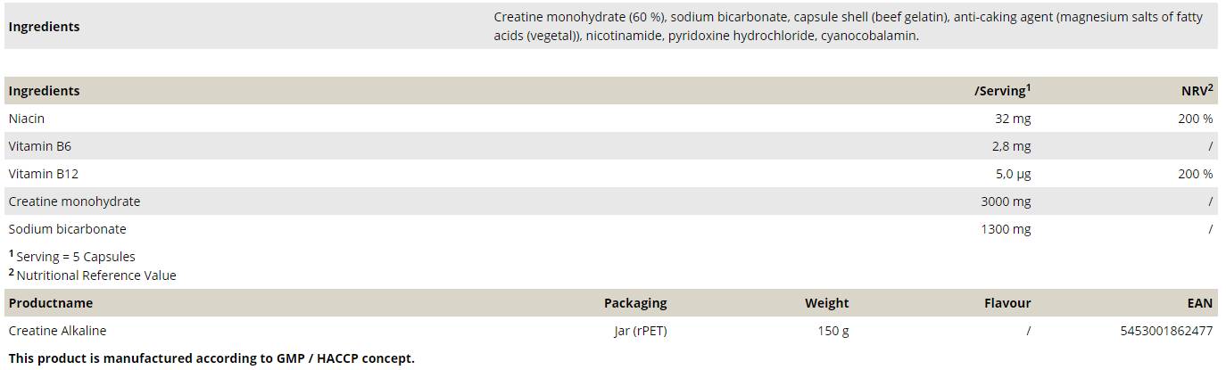 ALKALYNE CREATINE (стабилизиран с алкали ph>12) - Тази алкална формула на креатина го предпазва от преобразуване (чрез стомашната киселина) в неефикасен, натоварващ организма креатинин. По този начин той бива напълно абсорбиран от клетките (респ. МУСКУЛИТЕ), тъй като преминава непроменен през храносмилателната система. Alkalyne Creatine е предпочитаната форма от жените, защото не предизвиква задържане на вода под кожата и е перфектен за нисковъглехидратно хранене. Анаболният ефект се усилва посредством алкалната рецептура. Специалното (сравнително ново) креатиново съединение Creatine-Ethyl-Ester-HCI, НАПЪЛНО разтварящо се в течна среда се възприема изключително добре биологично и се препоръчва за спортисти, имащи проблеми с храносмилателния тракт (по-точно проблеми при храносмилането на мазнини), респ. не реагират добре на креатин монохидрат.