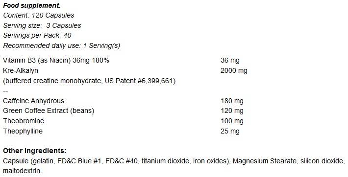 Допълнителните съставки, включително теобромин, теофилин и екстракт от зелено кафе, също играят важна роля, като насърчават разграждането на мазнините и увеличават енергийния разход по време на тренировка. В комбинация, тези активни вещества правят Hyper Kre-Alkalyn PRE незаменим спътник за всеки атлет.