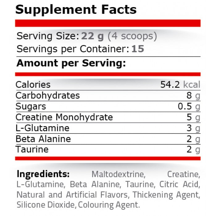 Креатина е най-популярната и една от най-ефективните добавки за сила и за мускулна маса. Креатинът повишава синтеза на аденозин три-фосфат, основата енергия за мускулните клетки. Той въздейства пряко върху увеличаването на силата и експлозивността, увеличава силовата издръжливост и времето за енергийно възстановяване между сериите.
