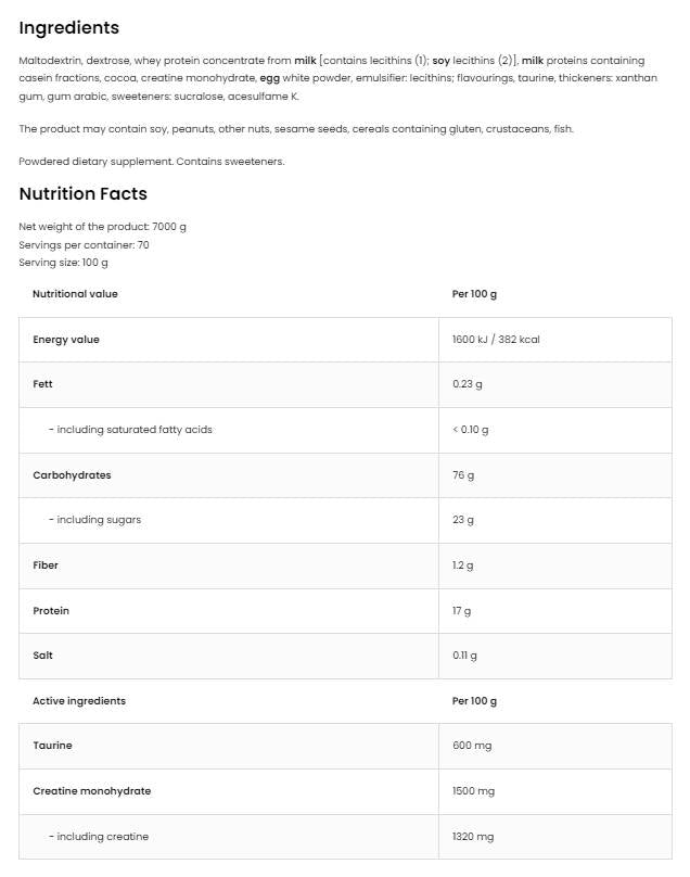 Анаболик Гейнър представлява мощна формула, предназначена за хора, които искат да увеличат мускулната си маса и да подобрят представянето си по време на тренировки. Съставът му включва креатин и таурин, които са известни с благоприятния си ефект върху физическата издръжливост, силата и възстановяването. Креатинът подпомага увеличаването на мускулната маса и подобрява спортните постижения, а тауринът играе важна роля в метаболизма на енергията и регулирането на електролитния баланс в организма.