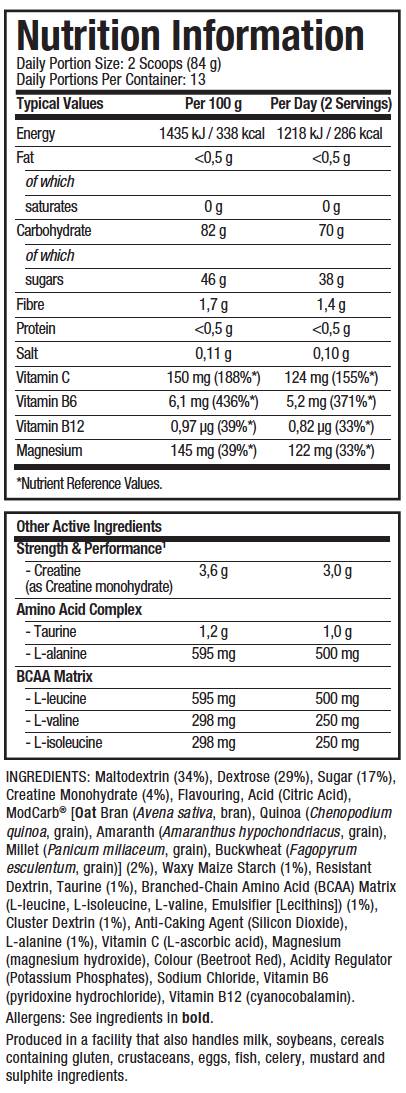 Този продукт използва патентована формула, която бързо попълва гликогена в мускулите и спомага за по-бързо възстановяване след натоварване. Подходящ за атлети и активни хора, които искат да поддържат високи нива на енергия през тренировъчния процес и да подобрят мускулната функция след изтощителни тренировки. Комбинацията от креатин монохидрат и въглехидрати подпомага целевата енергия и подпомага възстановяването на мускулната функция.