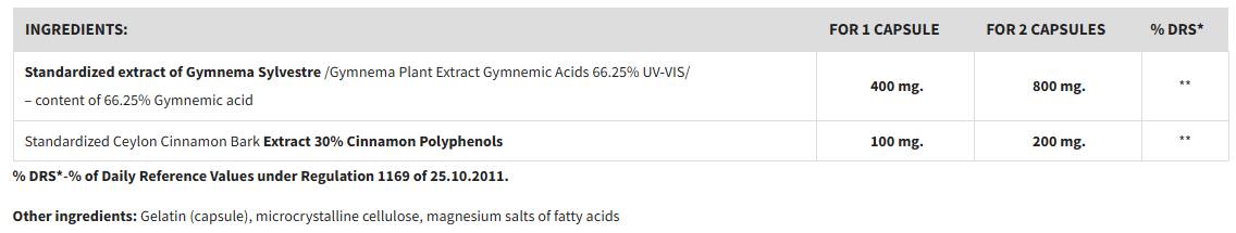 Gymnema Sylvestre & Cinnamon Bark 1000mg. е хранителна добавка, съставена от 100% натурален продукт. Комбинацията от тези съставки се характеризира с висока ефективност, отличен профил на безопасност, перфектна съвместимост с медикаментозно лечение и годност за дългосрочен прием.