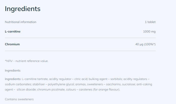 OLIMP Gold L-carnitine 1000 + Chromium / 20 Effervescent Tabs е хранителна добавка, под формата на разтворими таблетки, която подпомага ефектнивното изгаряне на мазнини.