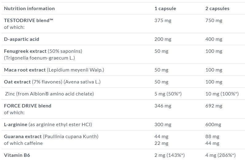 Съставки: д-аспарагинова киселина, мака - екстракт от корен, сминдух, цинк, л-аргинин, гуарана, екстракт, витамин В6