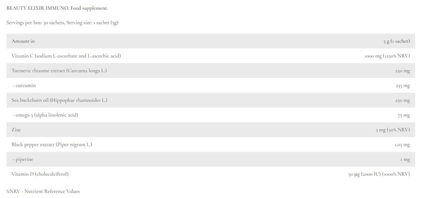 Beauty Elixir Immuno е хранителна добавка, която поддържа имунната система, която съдържа витамини C и D3, куркумин, цинк и пиперин. Не съдържа консерванти, изкуствени оцветители и овкусители, нито добавка на захар и подсладители.