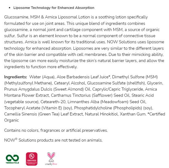 Липозомен лосион с глюкозамин, МСМ и арника е успокояващ лосион, специално формулиран за използване върху ставите. Тази уникална комбинация от съставки съчетава глюкозамин, нормален компонент на ставите и хрущялите, с MSM, източник на органична сяра. Сярата е елемент, известен като нормален компонент на структурите на съединителната тъкан. Арниката е добре известна с традиционната си употреба. NOW Solutions използва липозомна технология за подобрена абсорбция. Липозомите са много подобни на различните слоеве на кожната бариера и са съвместими с клетъчните мембрани. Благодарение на способността им да имитират, липозомите могат по-лесно да овлажняват естествените бариерни слоеве на кожата и да позволят на съставките да функционират по-ефективно.