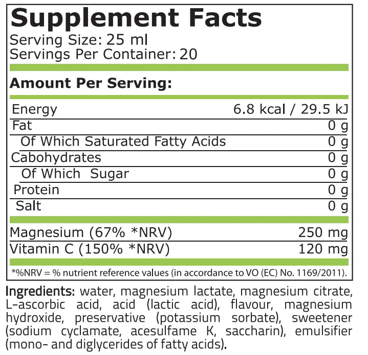 Формулата осигурява лесноусвоим магнезий в течна форма за по-бърза и ефикасна абсорбция. Магнезият е необходим за правилната минерализация на костите, за мускулните контракции и предаването на нервни импулси. Той е изключително важен за активиране на калций и калий в организма и е ко-фактор на над 300 ензими, включително ATP-зависимите ензими, което влияе върху енергийните процеси в всички органи и тъкани.