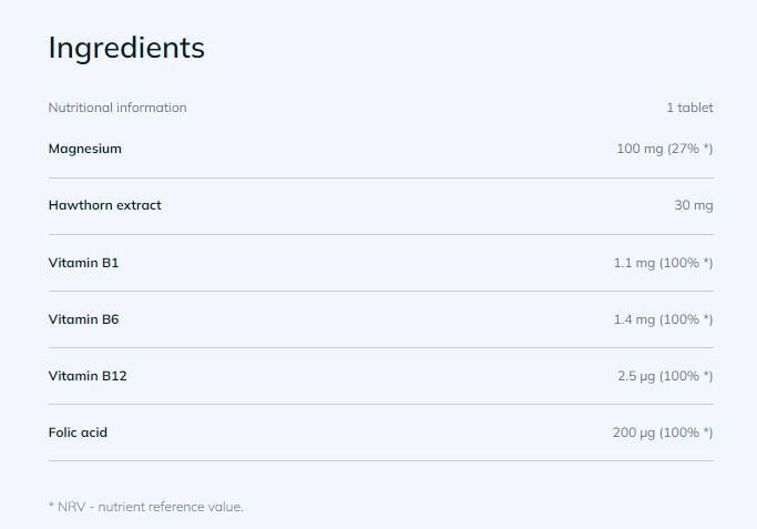 Съставки: Магнезий, Глог, Витамин В1, Витамин В6, Витамин В12, Фолиева киселина