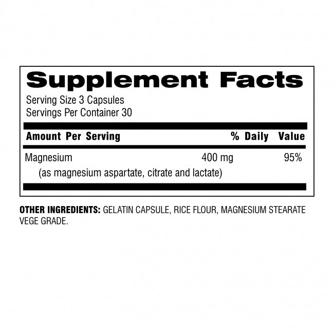 • Всяка капсула съдържа 400 мг Магнезий (като магнезиев аспартат, цитрат и лактат)