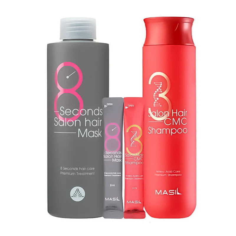 Разфасовка: Шампоан Masil 3 Salon Hair CMC Shampoo – 300 ml; тестери 8 ml (2 бр.); Маска Masil 8 Seconds Salon Hair Mask – 200 ml; тестери 8 ml (2 бр.).