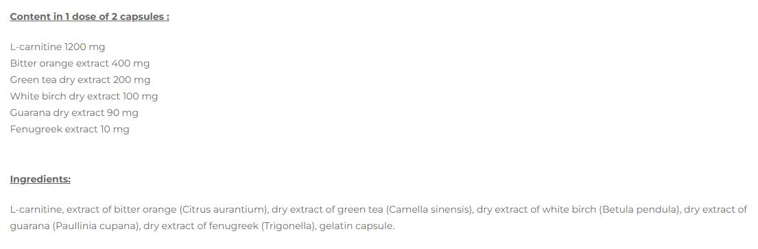 L-карнитин, екстракт от горчив портокал (Citrus aurantium), сух екстракт от зелен чай (Camella sinensis), сух екстракт от бяла бреза (Betula pendula), сух екстракт от гуарана (Paullinia cupana), сух екстракт от сминдух (Trigonella), желатинова капсула.