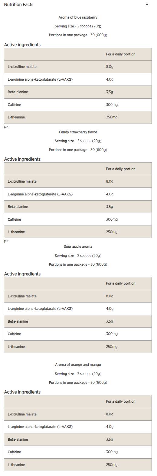 В допълнение, сме добавили ред известни и добре проучени съставки, включително 8mg цитрулин малат, 3,5g бета-аланин, 4g L-аргинин алфа-кетоглутарат и накрая 250mg L-теанин.