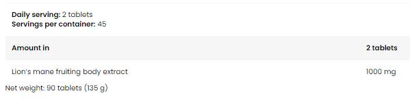 GOLD Lion's Mane 1000 от Kevin Levrone е богата на хранителни вещества, като аминокиселини, полипептиди и полизахариди. Съставът и включва различни витамини и минерали, например цинк, селен, натрий и желязо.