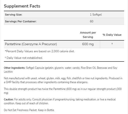 Пантетинът, активната съставка в този продукт, е важен за правилния метаболизъм на мазнините и енергията в клетките. Той играе съществена роля в производството на коензим A, който е необходим за множество биохимични реакции в тялото. Приемът на Pantethine 600 mg може да помогне за подобряване на общото здраве и енергийни нива, а също така да подпомогне здравословния баланс на холестерола и триглицеридите.