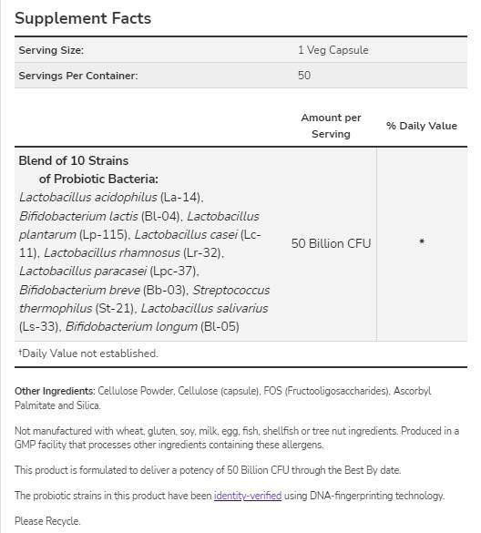 Probiotic-10 50 Billion е мощна формула, която комбинира 10 различни щама на пробиотици, осигуряваща 50 милиарда активни пробиотични култури на порция. Тези пробиотици играят ключова роля в поддържането на здравословна чревна флора, която е от съществено значение за нормалното функциониране на нашето храносмилателно здраве.
