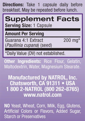 Гуарана 200 mg. на Natrol предоставя удобно решение за енергия през деня. Формулата използва гуарана като естествен източник и е разработена за активен начин на живот. Капсулите са лесни за прием и предлагат стабилен старт на деня без излишни добавки.