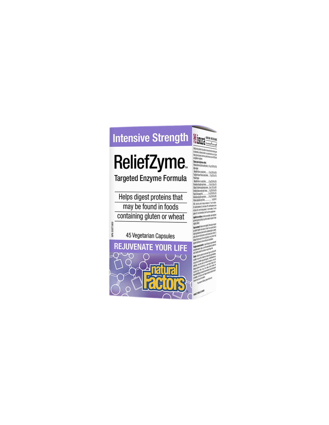 ReliefZyme™ Ензимна формула е уникално ензимно съчетание, което подпомага храносмилателната дейност и усвояване на полезните вещества от храни, богати на глутен, пшеница и млечни произведения. Чрез по-добро храносмилане, чувствително се редуцират стомашните неразположения като газове, подуване на корема и други оплаквания, свързани с хранителна чувствителност.