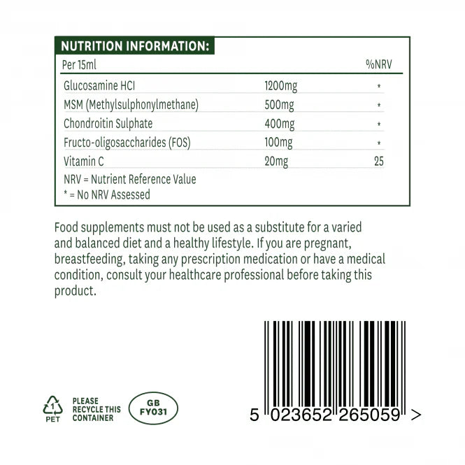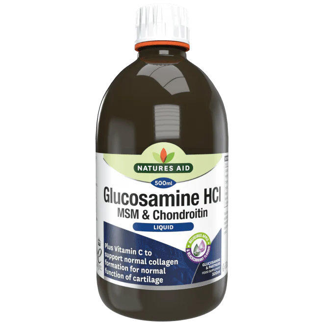 Natures Aid Glucosamine, MSM & Chondroitin Liquid e концентрирана течна формула с чудесен вкус на ябълка и касис. Доставя на тялото основните компоненти за здравето на ставите, ефективен начин за осигуряване на допълнителен глюкозамин и хондроитин в лесен за използване течен формат, който е особено удобен за тези, които се затрудняват да преглъщат таблетки.