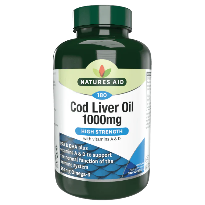 Natures Aid Cod Liver Oil капсулите са отличен източник на витамини А и D и много богати на омега-3 мастни киселини. Маслото от черен дроб на треска третира различни здравни състояния, вариращи от астма и сърдечни заболявания до артритни и неврологични състояния. Противовъзпалителните свойства на омега-3 мастните киселини предпазват от тежки здравословни заболявания, сърдечно-съдови заболявания, рак, диабет тип 2 като същевременно подобряват циркулацията на кръвта в организма, повишават здравината на клетъчната мембрана, участват в процеса на подобряване на кръвното налягане.