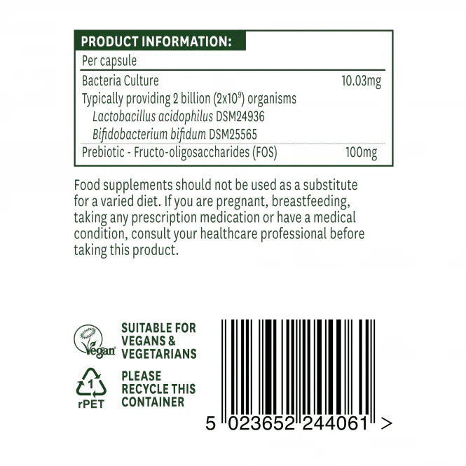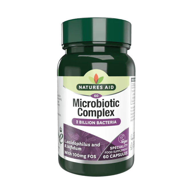 Natures Aid Microbiotic Complex е пробиотичен комплекс подходящ за ежедневна употреба. Всяка капсула осигурява 2 милиарда живи бактерии от 2 различни и научно изследвани щама, с доказана способност да оцеляват при преминаването си през храносмилателния тракт и ефективно да колонизират микробиома след поглъщане. Microbiotic Complex подпомага работата на храносмилателната и отделителната система и допринася за нормалното функциониране на имунната система. За обогатяване на стомашната флора с добри бактерии, по-добро храносмилане и по-пълно усвояване на хранителните вещества. С добавен пребиотик (нисковерижни фруктоолигозахариди) (ФОС), които представляват нискокалорични, нехронасмилаеми въглехидрати, действащи благотворно на имунната система, костното здраве и баланса на важни бактерии в стомашно-чревната система.