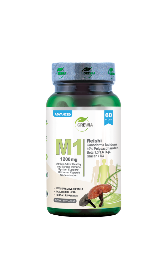 Feel You представя M1 | Гъба Рейши – D-β-Глюкан – D3 – 1200mg, таргитирана хранителна добавка за цялостна подкрепа на имунната система, метаболитния баланс и естествените защитни сили на организма. Това е високо концентрирана формула, обединена в 60 капсули, съчетаваща трите мощни имуномодулиращи съставки: стандартизиран екстракт гъба Рейши (плодно тяло) /Ganoderma lucidum 40% Polysaccharides - Pure fruit composition 98.5% НСl/, Beta 1,3/1,6 D-β-Glucan от Saccharomyces cerevisiae/ и Витамин D3 Холекалциферол /Cholecalciferol 90%UV - доставящ 400IU/. Тази комбинация е насочена към цялостна подкрепа на организма – имунитет, жизненост и естествена защита на клетките.