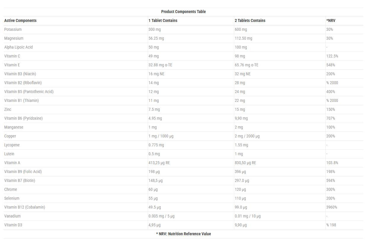 Антиоксидантната формула включва алфа-липоева киселина, ликопен и лутеин, които защитават очите и кожата и помагат на клетките срещу оксидативен стрес и вредните влияния на околната среда. Препоръчителният дневен прием: 1 таблетка дневно.