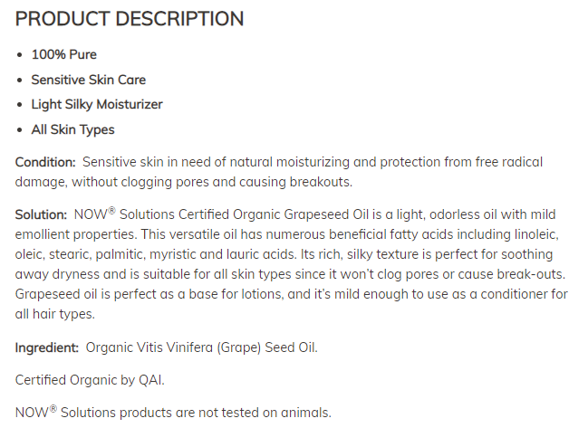 Решението: 100% чисто органично масло от гроздови семки е леко масло без мирис с омекотяващи свойства. Това универсално масло съдържа множество незаменими мастни киселини, включително линолова, олеинова, стеаринова, палмитинова, миристинова и лауринова. Неговата богата, копринена текстура е идеална за успокояване на дразненето и е подходяща за всички типове кожа, тъй като няма да запуши порите или да причини обриви. Маслото от гроздови семки е идеално като основа за лосиони и е достатъчно меко, за да се използва като балсам за всички типове коса.