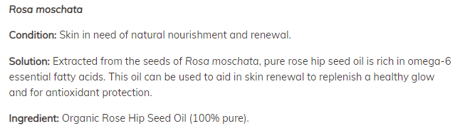 - Решение: Извлечено от семената на Rosa moschata, чисто масло от семена на шипка е богато на омега-6 незаменими мастни киселини. Това масло може да се използва за подпомагане на обновяването на кожата, за възстановяване на здравословен блясък и за антиоксидантна защита.