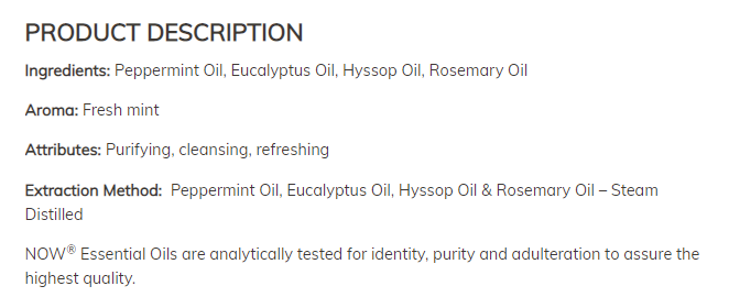 Използването на естествени етерични масла за ароматерапия е древна и уважавана от времето традиция, която подобрява настроенията от хиляди години. Етеричните масла са течни растителни есенции, които са истински отражения на ботаническите растения, от които са родени. Тази пречистваща смес се състои само от масла от мента, евкалипт, исоп и розмарин, създадени чрез естествен процес на дестилация, предлагащи най -чистото и най -мощното налично естествено етерично масло. Естествените етерични масла са силно концентрирани и трябва да се използват внимателно.