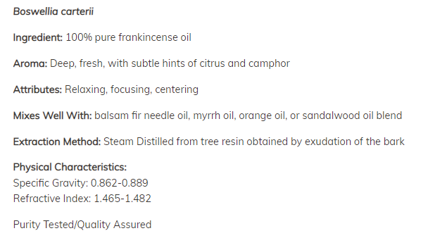 Тамянът има дървесна, пикантна миризма и може да се вдишва, да се абсорбира през кожата или да се приема като добавка.