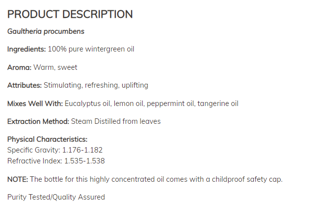 Активната съставка в маслото от зимна зеленина, метил салицилат, е тясно свързана с аспирина и има аналгетични и противовъзпалителни свойства. Като такива, продуктите, съдържащи зимнозелено масло, често се използват като противовъзпалително и локално обезболяващо.