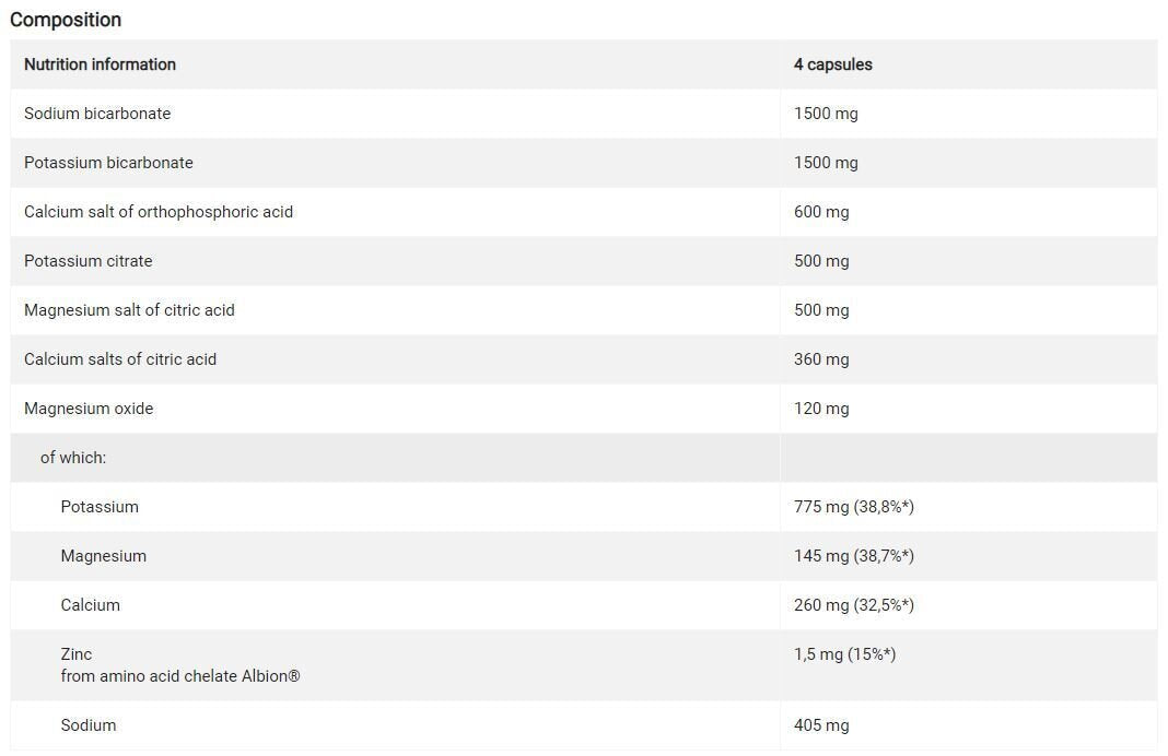 Продуктът съдържа соли на алкални метали и бикарбонати, както и цинк (под формата на аминокиселинен хелат Albion ®), което допринася за нормализиране на алкално-киселинния баланс в организма.