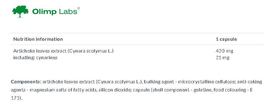 Състав : артишок екстракт от листа (Cynara scolymus L.), пълнител - микрокристална целулоза; противослепващи - магнезиеви соли на мастни киселини, силициев диоксид; капсула (капсула - желатин, хранителни оцветители - Е 171).