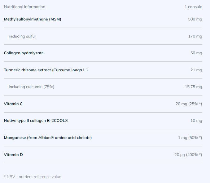 Съставките в продукта включват метилсулфонилметан (MSM), колагенов хидролизат, екстракт от куркума (Curcuma longa L.), витамин C и витамин D, както и манган. Заедно те работят за поддържане на нормалното функциониране на костите, ставите и съединителната тъкан, осигурявайки естествена подкрепа при натоварване и възстановяване.