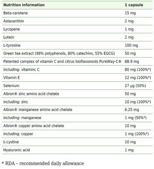 Antiox – protect skin Blend е комплекс от вещества, които са много важни при борбата с нежеланите лекарствени реакции на слънчевите бани. Освен меланина и красивия цвят, се формират огромни количества свободни радикали, когато се подлагаме на слънчеви бани. Те имат разрушително въздействие върху нейната структура и функциониране, и което е по – лошо, те причиняват преждевременно стареене на кожата и може да доведат до редица кожни заболявания. Активните полифеноли на силно концентриран екстракт от зелен чай, особено катехините, EGCG са невероятно ефективни срещу свободните радикали и предпазват кожата. Техните ефекти се допълват от PureWay – C (витамин Ц). Той представлява повече от силен много антиоксидант. Учените са установили, че е много ефективен за ускоряване процеса на възстановяване на кожата. Витамин Е допълва витамин Ц, той е силен антиоксидант и подобрява синтеза на меланин по време на слънчеви бани. Продуктът съдържа и най – силните антиоксидантни минерали в най – добрата им бионалична форма.