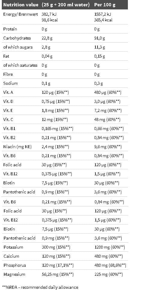 Начин на употреба: 1 доза (25 g = 1 и 3/4 мерителни лъжици) се разтварят в 200 ml. вода. В зависимост отинтензивността и продължителността на работата, консумирайте преди, по време или след интензивни усилия.