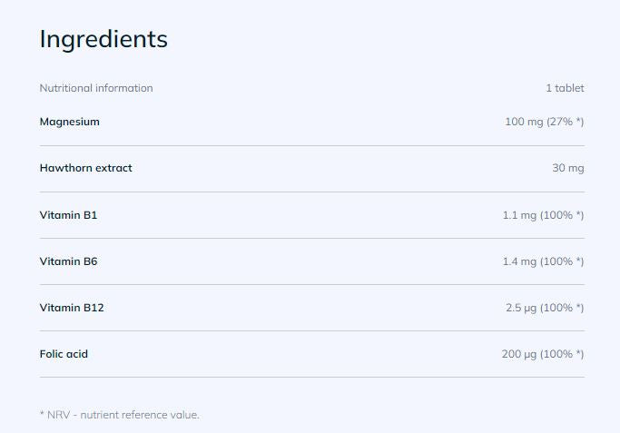 Активните съставки допринасят за устойчивост към стрес, предотвратяват отделянето на стресовите хормони и подпомагат нормалното функциониране на нервната система. Магнезият спомага за намаляване на мускулните спазми, ускорява възстановяването и намалява умората, което е особено полезно след тежки тренировки. Витамин B6 подпомага обмяната на веществата, повишава енергията и допринася за нормалното протичане на нервните функции. Формулата е обогатена и с цинк, който подпомага общото благосъстояние през натоварени периоди.