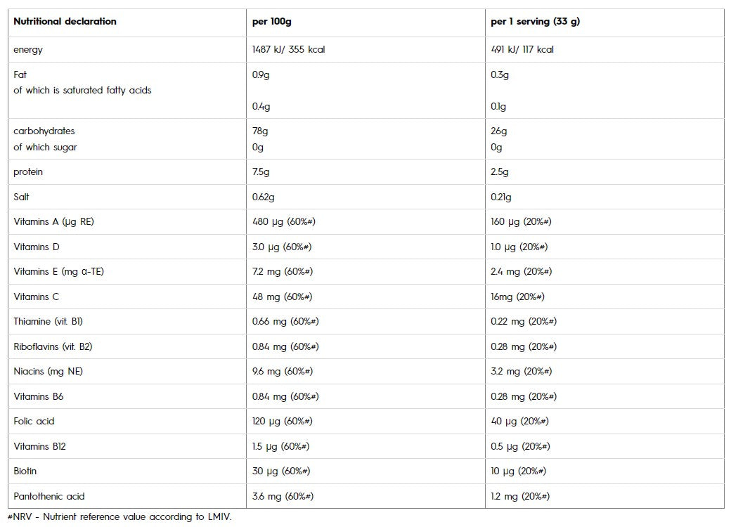 Съставки: 93,5% оризово брашно, 5% нискомаслено какао, подсладители ацесулфам К, сукралоза; витамини С, Е, ниацин, А, В12, D, В6, В2, В1, биотин.