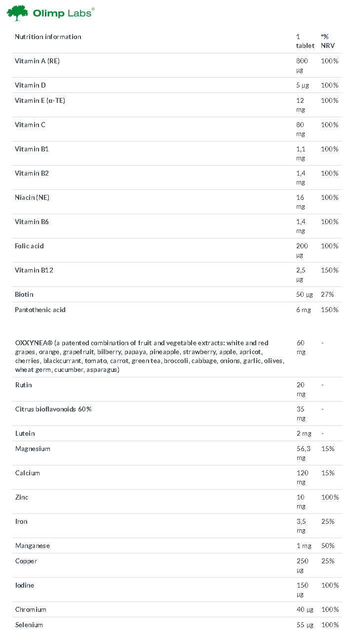 Това прави по лесно допълване на основните нужди от микроелементи на организма. Също така съдържа лутеин, рутин, цитрусови биофлавоноиди и OXXYNEA ® , патентована смес от 22 екстракта от плодове и зеленчуци.