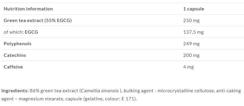 Зеленият чай съдържа богат набор от полифеноли (катехини, флавоноли, фенолни киселини) и метилксантини (кофеин, теобромин, теофилин). Катехините и кофеинът в съчетание стимулират термогенезата и разграждането на мастните запаси, подпомагайки естественото отслабване. OLIMP Green Tea предлага естествена подкрепа за изгаряне на мазнини, подобряване на метаболизма и обща виталност, комбинирана с полезните антиоксиданти.