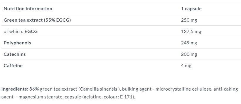 OLIMP Green Tea е богат източник на полифеноли (катехини, флавоноли, фенолни киселини) и метилксантини (кофеин, теофилин, теобромин). В човешкото тяло, катехините регулират дейността на много ензими, а също така засилват разграждането на мастната тъкан. В комбинация с кофеин катехините и киселинните фенолни засилват термогенезата. Така натрупаните в тялото мазнини се превръщат в енергия.