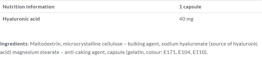 Това е уникална, иновативна добавка, която снабдява хранителния ви план с хиалуронова киселина – структурен и функционален компонент на съедителната тъкан, която осигурява правилната му овлажняваща и механична устойчивост. Има свойството на натурален биополимер и е необходим компонент за изграждане на кожно извънклетъчната матрица, прави кожата гладка, здрава, еластична и придава атрактивен външен вид. Освен това, хиалуроновата киселина образува структурния скелет на ставния хрущял, което го прави устойчив на деформация.