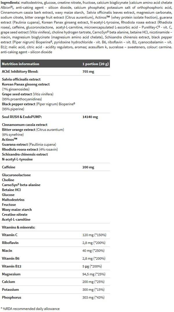 Soul Ripper ™ са избрани такива съставки, които не предизвикват увеличаване на мускулната възбудимост и засилване на ефективността на мускулните контракции в началото на тренировката, тъй като така или иначе, имате много енергия в началото, така че няма никакъв смисъл да се ускорява скоростта на използване на запасите на енергия, които ще бъдат необходими по-късно по време на натоварването.