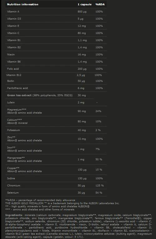 Витамините и минералите са химични съединения, които вземат участие във всички процеси на човешкото тяло. Те не могат да бъдат синтезирани от организма, което налага външен прием с храната. За съжаление, поради все по-високата консумация на преработена храна с нея не може да се внесе адекватно количество витамини и минерали. Техният недостиг допълнително се задълбочава при повишено напрежение и стрес, както и при все по-голямото замърсяване на околната среда. Недостигът им води до редица неблагоприятни състояния, свързани с влошаване на здравето, физическата и умствена форма и външния вид. Продуктът съдържа всички важни витамини и микроелементи на 100% от препоръчваните дневни дози.