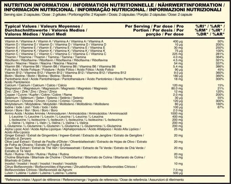 Opti-Men EU съдържа над 75 активни съставки, сред които витамини A, D, E, C, B-комплекс, минерали като магнезий, цинк и калций, свободни аминокиселини и ензими за подпомагане на храносмилането. Една доза от 3 таблетки осигурява богат набор от хранителни вещества, необходими на мъжа през натоварен ден.