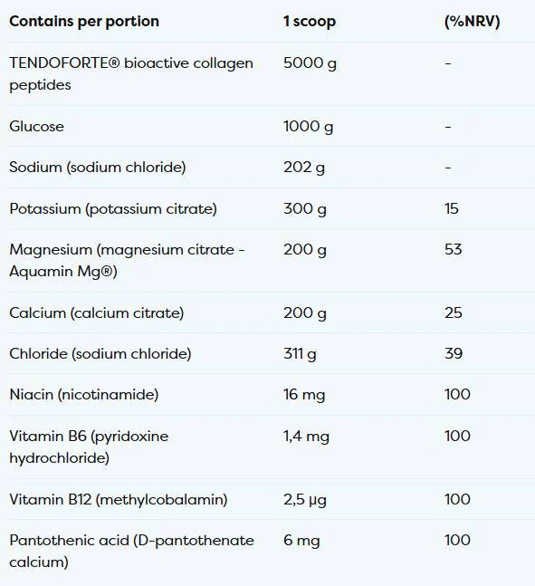 Съставът включва колаген пептиди (TENDOFORTE®) – биоактивен, патентован колаген, който подпомага структурна поддръжка (свързки, сухожилия), мускулна функция и възстановяване; глюкоза – бърз енергиен бууст и подпомага усвояването на електролитите; натрий, калий, магнезий (Aquamin Mg®), калций и хлорид – ключови електролити за водно‑електролитния баланс и мускулната функция; ниацин (витамин B3), витамин B6, витамин B12 и пантотенова киселина (витамин B5) – за енергийни процеси и намаляване на умора. Не е веган – съдържа колаген от животински източник.